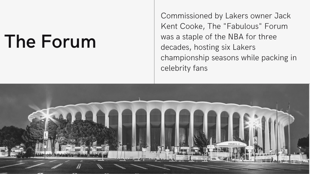 In a city that already had a Coliseum for football, it made sense to build a Forum for basketball. Opened in 1967 in Southwestern L.A., The Forum (which is still colloquially called “The Fabulous Forum” by locals and officially called “The Great Western Forum” for much of its lifetime due to a licensing deal) was funded by Lakers owner Jack Kent Cooke, who was tired of paying the lease on the team’s former home, the Memorial Sports Arena. It was a modern technological marvel, not just for its awe-inspiring outer design but also its unique roof and column structures which allowed basketball fans (and Kings hockey fans, concert-goers, etc.) perfect, unobstructed views. When Cooke sold the team and arena to Jerry Buss in 1979, the Forum became one of the city’s ultimate hot spots, with celebrities lining up to catch Showtime era Lakers games, sometimes court side and sometimes up in the luxurious owner’s box. It was also the site of the basketball tournament in the 1984 Olympics and the home of Wayne Gretzky for several years after he was traded to the Kings. Though the Lakers have now been gone for over two decades, relocating to the Staples Center in downtown L.A. in 1999, The Forum still stands and hosts concerts, boxing matches, award shows, and other major events. It was purchased by Clippers owner Steve Ballmer in 2020, so as to avoid a legal battle over building a new arena for his franchise.