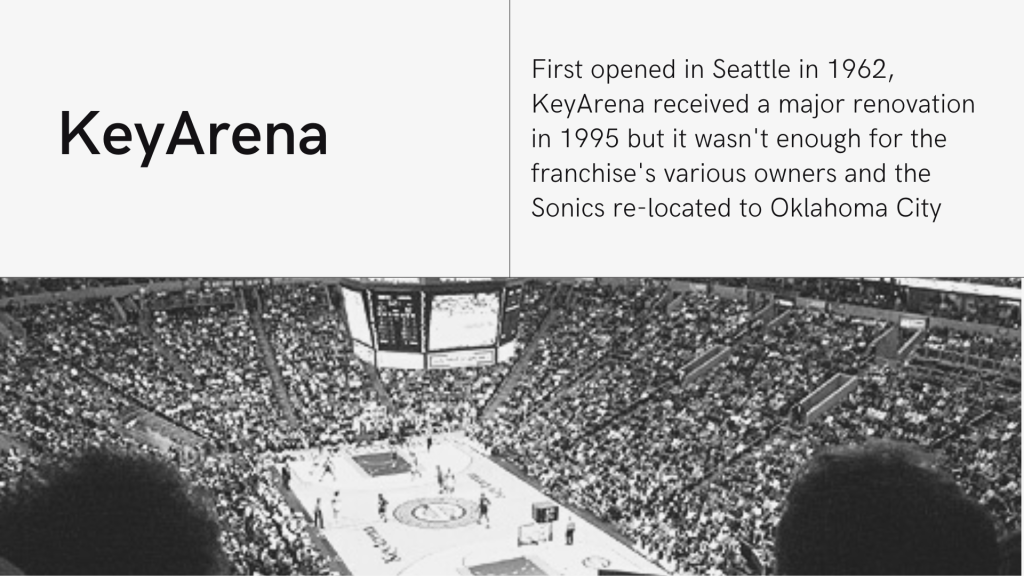 When the KeyArena first opened in 1962, the SuperSonics were still years away from becoming an expansion franchise. The original basketball tenant in the arena, then called the Washington State Pavilion (and later the Seattle Center Coliseum), was the Seattle University men’s team. The venue became the site of the Sonics’ inaugural season in ’67-’68 and their only and one NBA title in 1979, though they clinched the Finals that year on the road in Washington. Like so many venues that were built in the ’60s and ’70s as American pro sports massively expanded, the Seattle Center Coliseum was woefully outdated by the early ’90s. In fact, it was the site of the only rain delay in NBA history, a 1986 match-up against the Suns where rain leaked through the roof onto the court, causing the game to be postponed for 24 hours. When a new arena deal fell through, there were heavy rumors that Sonics owner Barry Ackerley would relocate the franchise. Seattle mayor Norm Rice managed to swoop in and create a unique arrangement wherein the Seattle Center Coliseum would be stripped and rebuilt using its frame as a baseline using public bonds and a revenue sharing plan between the team and city. It re-opened as KeyArena in 1995 (naming rights were sold to KeyBank) and the Sonics reached the NBA Finals in their first season in the modernized venue. But that honeymoon period was a brief one, as Starbucks CEO Howard Schultz purchased the team in 2001 and almost immediately began lobbying the city for a publicly funded new arena. When the city refused, he sold the team to Oklahoma City’s Clay Bennett, who quickly relocated them to his hometown. KeyArena remained busy in the ensuing years, still hosting the Seattle Storm of the WNBA, Seattle University, plus the usual slate of concerts and events. With an NHL expansion franchise looming in 2017, the city of Seattle finally agreed to public funding to once again modernize KeyArea. When the redevelopment was complete, the naming rights were sold again, this time to Amazon, who dubbed it Climate Pledge Arena.