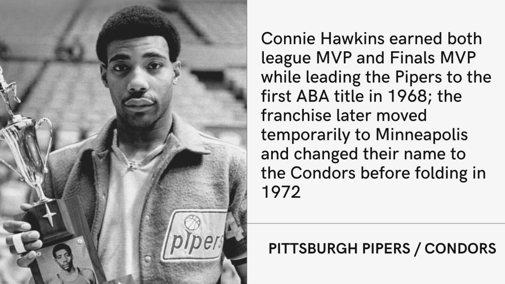 The city of Pittsburgh has seen plenty of NFL, MLB, and NHL championships in the last half century, but only one pro basketball title. Before the “We Are Family” Pirates, Steel Curtain Steelers, or Sidney Crosby Penguins owned the city, that one basketball championship came courtesy of the Pittsburgh Pipers in 1968, when they won the inaugural ABA Finals, a dramatic seven-game affair against the New Orleans Buccaneers. Their star player was Connie Hawkins, the Rucker Park legend who was black balled from the NBA and came to the Condors after a stint with the Harlem Globetrotters. Hawkins was a dominant force, leading the league in regular season and playoff scoring, and winning the MVP en route to carrying Pittsburgh to the title. The rest of the roster was talented top to bottom, with solid veteran supporting players like Chico Vaughn and Art Heyman surrounding Hawkins, and the Pipers had strong local support, as the Steelers and Pirates were in the midst of prolonged slumps, while the newly founded Penguins were struggling to find footing. But then, owner Gabe Rubin seemingly lost his mind. He moved the franchise just weeks after the championship was won, landing in Minneapolis, where the Minnesota Muskies had already failed to succeed the year before . The Minnesota Pipers struggled on the court, due mainly to a knee injury to Hawkins and several coaching changes, and failed to draw any fans, prompting Rubin to inexplicably move the team back to Pittsburgh. Mostly ignored by scorned fans, the Pipers couldn’t overcome the loss of Hawkins to the NBA, and fell to the bottom of the ABA standings in ’69-’70. Rubin mercifully sold the team in 1970, but by then the damage was already done in Pittsburgh, and with the Steelers and Pirates becoming title contenders, the locals couldn’t be bothered to care anymore about pro basketball. Hoping a re-branding would drum up interest, the new ownership held a contest to rename the team. “Pioneers” was adopted, and then immediately dropped when a local college with the same nickname threatened to sue. Condors was then selected, with no real explanation (indigenous to only the West coast of North and South America, no non-captivity condor has ever come close to the Steel City). Unable to return to the playoffs in 1971 or draw more than 1,000 fans per game, the Condors owners, desperate to make it to a merger with the NBA, took on drastic measures, even going so far as to calling the team the United States Condors and hosting games in locations as far flung from Pittsburgh as Birmingham, AL and Tucson, AZ. The league office finally put the Condors of their misery at the end of the ’71-’72 season.