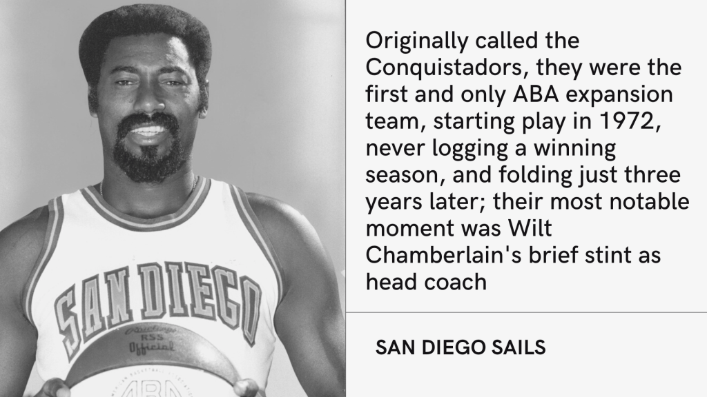 The first, and only, ABA expansion franchise, the Conquistadors were rushed into production in 1973 to fill a void in San Diego left by the NBA’s Rockets leaving for Houston two years prior. The team that came to be known colloquially as the “Qs” were owned by Leonard Bloom, a former orthodontist who made big money in real estate, then spent years trying to get second level pro teams off the ground in San Diego (in addition to the Conquistadors, he also founded an AHL hockey team and a WTT tennis team). An early harbinger of the team’s financial struggles was Bloom’s immediate animosity with Peter Graham, manager of the state-of-the-art San Diego Sports Arena. Bitter that his own ownership bid had been denied and unwilling to negotiate with Bloom, Graham refused to let the Conquistadors play in his arena and the team was forced to call nearby Peterson Gym (home of the San Diego State basketball teams) home, despite its paltry 3,200 seat capacity. Bloom attempted to make a huge splash in 1973 when he signed Wilt Chamberlain as a player-coach. Wilt’s former NBA team, the Lakers, weren’t pleased with this arrangement, however, and successfully sued to block Chamberlain from playing for the Conquistadors. He was relegated to being just a coach, and an apathetic one at that, often outright skipping games to promote his autobiography. With Caldwell Jones leading the way on the floor, San Diego still managed to reach the playoffs in 1974 in spite of their insouciant coach, but slipped in standings in ’74-’75 as Bloom was unable to lure any decent pieces to build around Jones. He also failed to secure a new arena in nearby Chula Vista and in the summer of 1975 finally gave in, selling the franchise to former Nuggets co-owner Frank Goldberg. Goldberg looked to completely rebuild the franchise brand from scratch to make it more appealing for the expected NBA merger. He changed the team name to Sails, classed up their jersey colors and logo, and hired Bill Musselman as coach. The Sails also finally moved into Graham’s San Diego Sports Arena, but the arena was mostly empty for the first few home games of the ’75-’76 season and Graham was quickly losing money. A report surfaced that the Sails’ chances of being included in the impending merger were supposedly minuscule, as Lakers owner Jack Kent Cooke wasn’t keen to the idea of another NBA franchise in Southern California. Disheartened and increasingly disinterested, Goldberg folded the franchise just 11 games into the season. The ABA executive office had to quickly reshuffle the remaining league schedule, and San Diego’s entire roster was essentially put on an auction block. San Diego did get another NBA franchise just three years later when the Buffalo Braves moved to town and became the Clippers, but they would stay for just five seasons before heading north to Los Angeles.