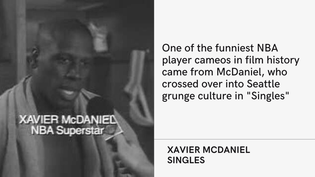 The film “Singles” wasn’t quite the watershed moment in Seattle grunge culture that it purported to be, but it was an enjoyable coming-of-age indie film in the grand Cameron Crowe tradition. True to its musical nature, the movie featured cameos from Soundgarden, Tad, and Alice in Chains, plus Pearl Jam founding members Eddie Vedder, Jeff Ament, and Stone Gossard popping up as the backing band to Matt Dillon’s singer character. At the time of filming, the group was still known as Mookie Blaylock, with the change to Pearl Jam coming later over fears of potential litigation. But that’s not the only basketball connection in the film. It also features a cameo from Sonics cult hero Xavier McDaniel, better known as The X-Man. When the character Steve, played by Campbell Scott, is trying to hold out longer during sex with his girlfriend (played by Kyra Sedgwick), he attempts to distract himself by envisioning a typical McDaniel post-game locker interview. In a clever bit of fourth wall destruction, McDaniel turns to the camera and implores Steve not to finish just yet.