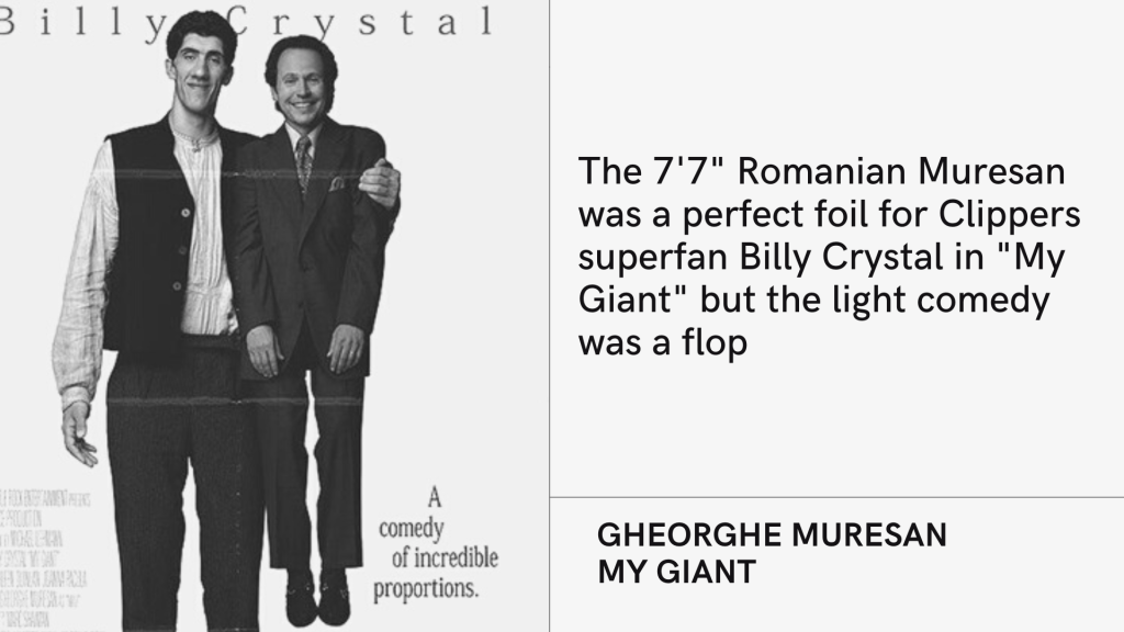 Thought of as a baseball fan first, as his painstaking work on the movie “61*” would attest, Billy Crystal has always been just as big of an NBA acolyte. Though Crystal retained the Yankees fandom of his Long Island upbringing, in basketball he switched allegiances to the Clippers after becoming a movie and TV star in Los Angeles in the ’80s. Generally known now as the Clippers’ most famous supporter, he stands in stark contrast to the lionized Lakers fans that inhabit the same building on separate nights, like Jack Nicholson, Leonardo DiCaprio, and Denzel Washington. After his directorial debut, the black comedy “Mr. Saturday Night,” was a critical and financial flop, Crystal decided that his follow-up would return to the romantic comedy well that he mined so successfully in “When Harry Met Sally.” The resulting film was “Forget Paris,” starring Debra Winger as Crystal’s love interest. Wisely jettisoning any possible concept of positing himself as a basketball player, Crystal made the next logical leap by playing an NBA referee. That allowed him to work in sizable cameos for Charles Barkley (who is convincingly menacing when arguing with Crystal over a call), David Robinson, Isiah Thomas, Kareem Abdul-Jabbar (whom Crystal hastily ejects from a game during his retirement ceremony season), Patrick Ewing, Reggie Miller, Kurt Rambis, and Spud Webb, amongst others. Three years later Crystal was again acting alongside an NBA player, but this time the movie had nothing to do with basketball. In “My Giant,” Crystal plays a Hollywood agent who stumbles upon a Romanian giant named Max, portrayed by the 7’7″ Gheorghe Muresan. Muresan had spent a few years with the Bullets by then and developed into a solid contributor despite the sideshow oddity of his stature. The movie centers around Crystal’s character’s attempts to get Max a starring role in a Steven Seagal (who plays himself) action flick and turn him into a star, indubitably the conceit in real life of giving the role to Muresan. Though Max nails the portrayal, the film ends on a maudlin note, as a genetic heart disease causes him to cut his career short after one film. In a case of life imitating art, Muresan never made another appearance on screen (it didn’t help that “My Giant” was a flop), though his actual life had a happier ending. His NBA career continued until 2000, and he now runs a basketball academy for children while working in the Wizards’ marketing department.