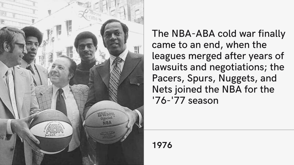 Though many of the owners may have denied it, the ABA was obviously established in 1967 with the express long-term goal of a merger with the NBA. It was a smart investment as ABA franchises were much cheaper and would increase exponentially in value upon a merger, though only four owners would ultimately manage to take advantage. A merger almost happened as early as 1970, but a lawsuit from Oscar Robertson delayed it for several years. When it finally came to pass in 1976, the Nets, Spurs, Pacers, and Nuggets joined the NBA as virtual expansion teams, forced to pay an expansion fee and receiving reduced television and gate revenues. The rosters of the non-merged teams were distributed across the NBA while the owners received solid settlements. Several ABA stars like Julius Erving, George Gervin, and David Thompson immediately took the NBA by storm with their free-wheeling, high-octane offensive styles while others like Louie Dampier struggled to adjust.