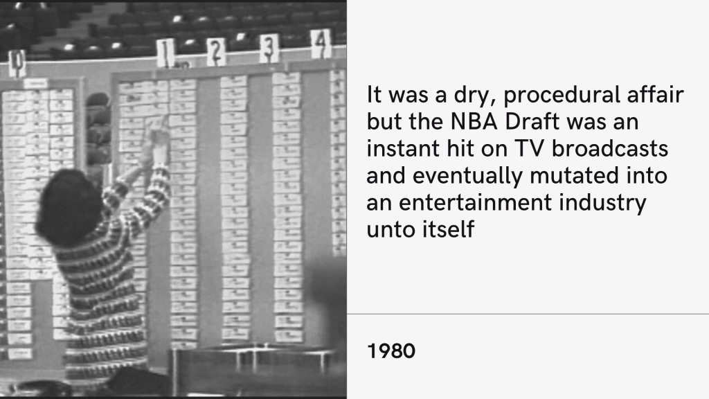 By the end of the ’70s, NBA television ratings had tanked so severely that CBS had reverted to regularly airing games on tape delay. But against that backdrop, the league took a calculated risk in 1980 by televising the draft for the first time. In the same year that the NFL Draft was first shown on TV by ESPN, the NBA Draft went out live to viewers from the Sheraton Centre Hotel in New York on the USA network. Though it lacked the star power of the previous year’s draft, where Magic Johnson was selected first overall, the 1980 edition had no shortage of drama. The Celtics traded the first overall pick to the Warriors, who used it on Purdue’s Joe Barry Carroll. In return, Boston received Robert Parish and the third overall pick, which they used on Minnesota’s Kevin McHale, setting the stage for their ’80s dynasty. USA retained the draft broadcasting rights until the mid ’80s, when TNT/TBS took over right as the lottery system injected a new level of excitement into the proceedings. While the early draft broadcasts were dry, procedural affairs, they’ve developed over the years into entertainment arguably on par with the games themselves,