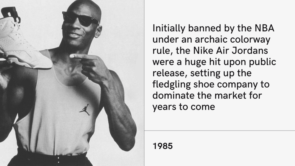 Shoe endorsements were nothing new when Michael Jordan was drafted by the Bulls in 1984 and subsequently inked a deal with Nike. From Walt Frazier and Puma to Dr. J and Converse to Moses Malone’s signature Air Force 1’s, NBA stars were regularly hauling in large sums just for sporting unique kicks. But this was an unparalleled marriage of the greatest star in the sport’s history with a fledgling but keen sportswear company. Jordan took the court in his rookie season wearing the Nike Air Ship and it was immediately banned by the league under an archaic color percentage rule that was eventually repealed. Nike wisely jumped on the marketing opportunity, claiming Jordan’s sneakers were banned for providing him an unfair advantage and covering the Bulls star’s fines as he continued to wear them during games. In the spring of 1985, they released the shoes to the general public as the Air Jordan I (with a new color scheme that fit within the NBA regulation) and shoe culture has never been the same. Even now, almost two decades removed from Jordan’s last NBA appearance, the Air Jordan is still the most popular basketball shoe brand in the world and sneaker sponsorships have since become a rite of passage for any young NBA star. By the way, if you picked up an Air Jordan I in 1985 for its original retail price of $65 and still have them in relatively good condition, they’re going for thousands of dollars now on the re-sale market.