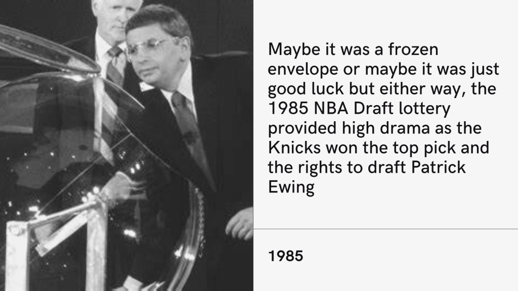 1984 should have been a coronation year for David Stern and the NBA, with the Lakers and Celtics matching up in the NBA Finals for the first time in the Magic Johnson-Larry Bird era, the new substance abuse policy helping to win over casual fans, and surefire superstars Hakeem Olajuwon and Michael Jordan headlining a supremely talented draft class. But the home stretch of the ’83-’84 season was still marred by yet another scandal, as the Rockets and Bulls were amongst several teams obviously tanking down the stretch to improve their draft position. Seeking to counteract this practice, the league instituted a lottery system starting in 1985, whereby the non-playoff teams’ draft order would be determined by Stern randomly selecting envelopes out of a hopper. When the Knicks won the first lottery and the rights to draft Patrick Ewing, Stern was immediately accused of chicanery, with many still maintaining that he froze the Knicks’ envelope to ensure he selected it. Though this conspiracy theory seems unfounded, the league still responded by tweaking the system over the years both to safeguard its integrity and respond to teams finding new ways to tank.