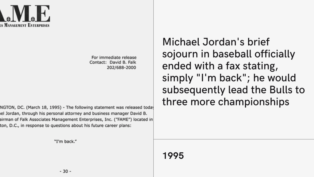 Whether it was burnout, wanderlust, or a clandestine request from the league office, Jordan’s 1993 retirement announcement was maybe the most notable in sports history (give or take a Lou Gehrig). The then three-time league MVP and three-time Finals MVP was already in the discussion of greatest player of all time and had become a cottage industry unto himself, with specialty licensed shoes, video games, sports drinks, and even a cologne. But he was also exhausted from years of top-level pressure, the recent murder of his father, and the media firestorm around his supposed gambling addiction. Like many a grieving child has done, he opted to go through with his late father’s wishes, making an attempt at a pro baseball career. The league certainly suffered in terms of interest and television ratings but the talent level was still incredible, with stars like Scottie Pippen and Hakeem Olajuwon filling the attention void with career peaks. After Jordan’s time with the White Sox ran its course with minimal success, he announced his return to the NBA in March of 1995 with an infamously terse fax that read, simply, “I’m back.” Because his #23 jersey had been retired by the team, Jordan wore #45 on March 18, 1995, when he scored 18 points in a loss to the Pacers. A rusty Jordan and the Bulls were knocked out of the playoffs in the Conference Finals that spring by Orlando but a year later they broke the record for wins in a season with 72 and embarked on a championship three-peat.
