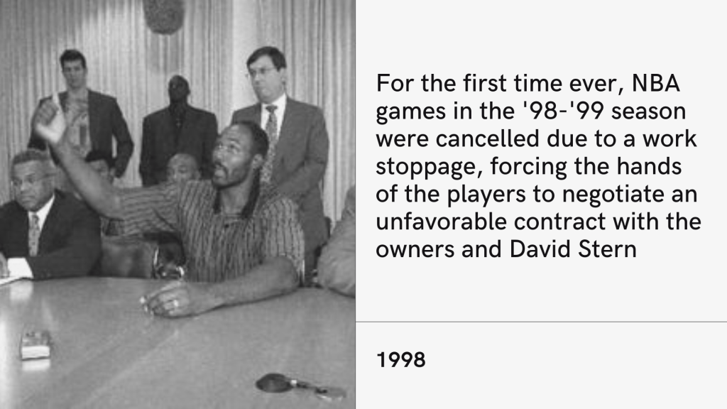 Labor disputes in U.S. pro sports was nothing new by the late ’90s but this was a significant event in two ways. First, almost all major previous shutdowns had been a player strike but this was the first significant owner lockout of a U.S. sport. That signified a considerable shift in American attitudes towards labor relations that had been building since the ’70s. This was also the first time the NBA had to actually cancel games due to a labor disagreement, something the MLB, NFL, and NHL had all dealt with previously. There had never been a player strike in NBA history but there was actually brief, un-obstructive lockouts in 1995 and 1996. With both franchise revenue and franchise expenses rising exponentially through the ’90s, it was seemingly inevitable that a work stoppage would eventually disrupt the regular season. That finally did happen in 1998, when the owners ceased operations in June of 1998 and didn’t resume until a negotiation was settled in January of 1999. That final settlement was an unquestionable victory for the owners and commissioner David Stern, as the NBA became the first pro league to cap individual player salaries, a rookie pay scale was introduced, and mandatory drug testing was expanded. The ’98-’99 season was shortened from 82 games to 50 and is widely considered one of the worst in NBA history, as rusty and out-of-shape players meandered through an arguably lost year.