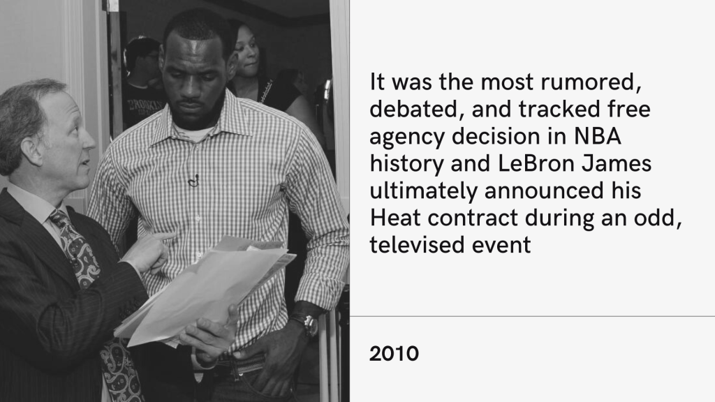Players greater than James may eventually come and go in the NBA, but it’s hard to imagine anyone will ever change the league with a free agency decision the way he did in 2010. In a one hour-plus special on ESPN, James raised over $2 million for the Boys and Girls Club while announcing that he would be “taking his talents to South Beach,” joining fellow All-Stars Dwyane Wade and Chris Bosh on the Heat. It completely altered the way fans, players, owners, and the media perceived free agency, player-owner power balances, and the marketing of the sport’s top talent. It proved that players finally had bargaining power on their side in a way that early pioneers like Oscar Robertson could only dream of, and kicked off the era of the NBA “super team.” It also turned James into a pariah in certain circles, especially in his hometown of Cleveland, where fans burned his jersey in effigy and turned his name into epithets like “LeFraud.” All was forgiven four years later, when James returned to the Cavaliers as a free agent and then carried them to the 2016 championship.