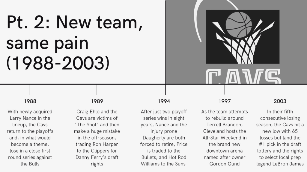 Ohio born and bred (in Cincinnati), Hill returned to his home state in 1993, when the Warriors traded him to the Cavaliers following his third NBA season. A lottery pick disappointment early in his career with Golden State, Hill arguably reached his full potential under Mike Fratello in Cleveland, vacillating between a bench power forward spot and an undersized starting center. Over four seasons, Hill averaged 11.7 points and 9.2 rebounds per game and made his lone All-Star appearance representing the Cavs in 1995. His 60.0% shooting from the field in ’96-’97 was the second best mark in the NBA that year and stood as Cleveland’s single season all-time record until ’21-’22 when Jarrett Allen broke it. Hill’s time with the Cavaliers was also marked by injuries and in 1997 he was traded as part of the deal that brought Shawn Kemp to Cleveland. After some time with the Bucks and 76ers, which included a trip to the 2001 NBA Finals, Hill came back to the Cavaliers via trade in ’01-’02. The veteran big man found his minutes exponentially decrease on a rebuilding (i.e., tanking) Cavs roster and in 2003 he was waived when the Cavaliers couldn’t find a willing trade participant at the deadline. His rebound percentage of 19.1% remains the franchise career record.