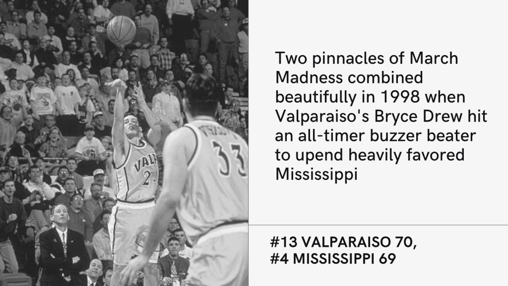 It’s a game that has everything you could possibly ask for of March Madness. A likable underdog. A stunning upset. A loyal coach’s son. A legit buzzer beater. A clever final play call that took full advantage of numerous players’ skill sets. Unfortunately for Mississippi’s Ansu Sesay, there was also a goat (in the traditional sense of the word). A 79% free throw shooter for the season, Sesay inexplicably missed two in a row at the line with a 69-67 lead and 4.9 seconds left. This set up one last play for Valparaiso to tie or take the lead and in the huddle, every player knew what was coming. It was an end-of-game play they had practiced countless times, usually unsuccessfully, but this was their first attempt deploying it in an actual game setting. The inbound passer was Jamie Sykes, a center field prospect for the Diamondbacks with the obvious arm strength and accuracy to send it the length of the court. Sykes placed it perfectly into the hands of Bill Jenkins, who immediately passed it slightly back to a streaking Bryce Drew. Drew’s father, Homer, had taken the head coaching job at Valparaiso a decade earlier. Though many big programs recruited the younger Drew out of high school, he opted to play for his dad, who was watching on as Bryce caught the ball perfectly in rhythm, then launched it into the basket for the stunning win. While the coach’s son was being mobbed on the floor by his jubilant teammates, cameras caught a distraught Sesay wandering the court in disbelief. The Crusaders moved on to upset Florida State in the second round before getting eliminated in the Sweet 16. Drew was drafted that summer by the Rockets and spent six years in the NBA before returning to Valparaiso to take over as head coach for his retiring father in 2011.