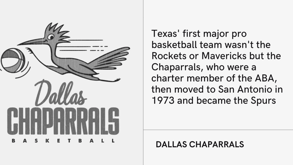 One of the original 11 ABA franchises in ’67-’68, the Dallas Chaparrals became the first major pro basketball team in Texas, predating the Houston Rockets by four years. Though they were only competing with the Cowboys for pro sports dominance in the city at the time, the Chaparrals struggled to draw fans, and ownership attempted to rebrand as a team representing all of Texas, scheduling games all across the state. One the sites that occasionally hosted contests was San Antonio, where a group of businessmen teamed up in 1973 to purchase the team and permanently place them in the city. Initially called the Gunslingers, their name was changed to San Antonio Spurs right before the ’73-’74 ABA season and though they never won a league title, the Spurs were one of four franchises that joined the NBA after the 1976 merger. Dallas would soon after get its own NBA franchise in 1980, when the Mavericks joined as an expansion team.
