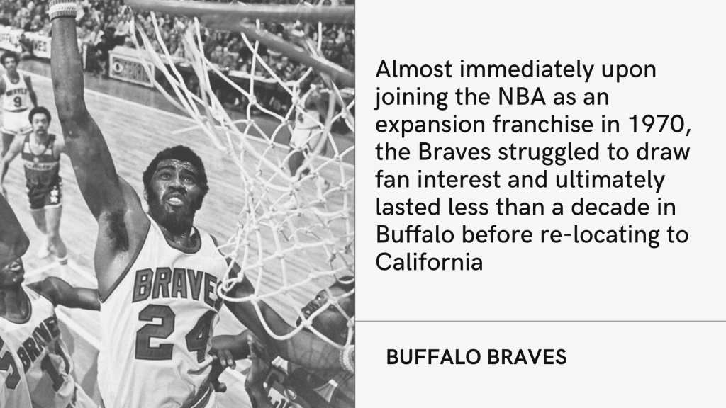 Following in the footsteps of the Rochester Royals, who left for Cincinnati in 1957, and the Syracuse Nationals, who moved to Philadelphia in 1963, Buffalo became the third upstate New York city to receive an NBA franchise. The Buffalo Braves began play in ’70-’71 and soon proved why the area was such a difficult place for an NBA team to find success. Even as the Braves became a contender in the mid ’70s, complete with an MVP winner in Bob McAdoo, attendance floundered. Ownership was in a near constant battle with the Buffalo Sabres of the NHL and the Canisius Golden Griffins of the NCAA for scheduling priority in the Buffalo Memorial Auditorium, and the imbalanced schedule cost the Braves any momentum in building a consistent fanbase. When a move to Miami was blocked by a lawsuit from the city of Buffalo, owner John Brown took unprecedented measures, essentially trading the Braves to Irv Levin for the Celtics. Because attendance had dipped to the point where the Braves were able to break their lease with the arena, Levin was then able to move the franchise to San Diego and rename them the Clippers. In their six years in San Diego, the Clippers failed to make the playoffs and finished above .500 just once, with a 43-39 record in ’78-’79. Levin sold the franchise to real estate mogul Donald Sterling, who moved them 120 miles north to his hometown of Los Angeles. The NBA sued Sterling to block the move, but he countersued and eventually won, allowing the Los Angeles Clippers to begin play in ’84-’85.