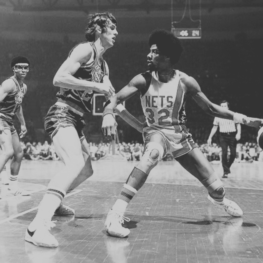 The New York Nets are crowned champions of the ninth and final ABA season after defeating the Denver Nuggets 112-106 in game six of the ABA Finals. Julius Erving finishes with 31 points and 19 rebounds and is named ABA Playoffs MVP for the second time. The game also features strong performances from two other future NBA All-Stars: David Thompson, who leads all scorers with 42 points, and Dan Issel, who finishes with 30 points and 20 rebounds.