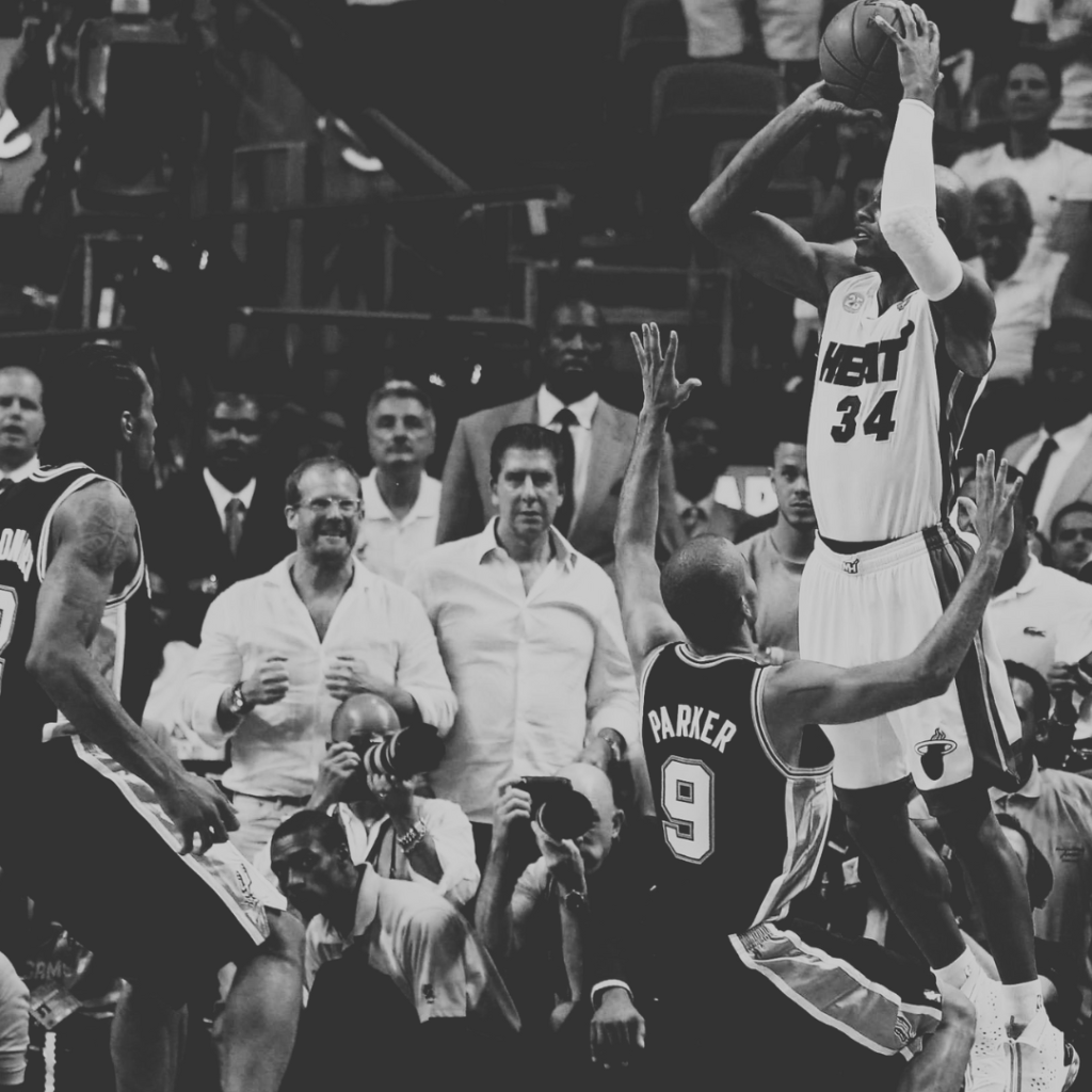 Game six of the NBA Finals is arguably the greatest in NBA history, a back-and-forth battle that ends with an improbable Heat comeback topped off by a Ray Allen three-pointer to force overtime, where Miami prevails over the Spurs 103-100 to even the series at 3-3. San Antonio led by 10 points heading into the fourth quarter but their offense falls apart down the stretch, including key missed free throws from Manu Ginobili and Kawhi Leonard. LeBron James finishes with 32 points, 11 assists, and 10 rebounds.