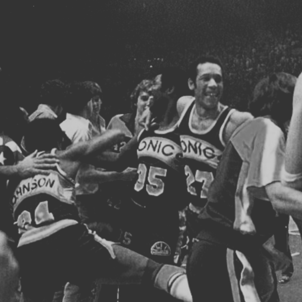 The #7 seed SuperSonics reach the Western Conference Finals with upsets of the Mavericks in the first round and the Rockets in the Conference Semifinals. The final game of the Conference Semifinals series is a double overtime thriller, in which Hakeem Olajuwon finishes with 49 points (a Rockets playoff game record) and 25 rebounds in a losing effort.